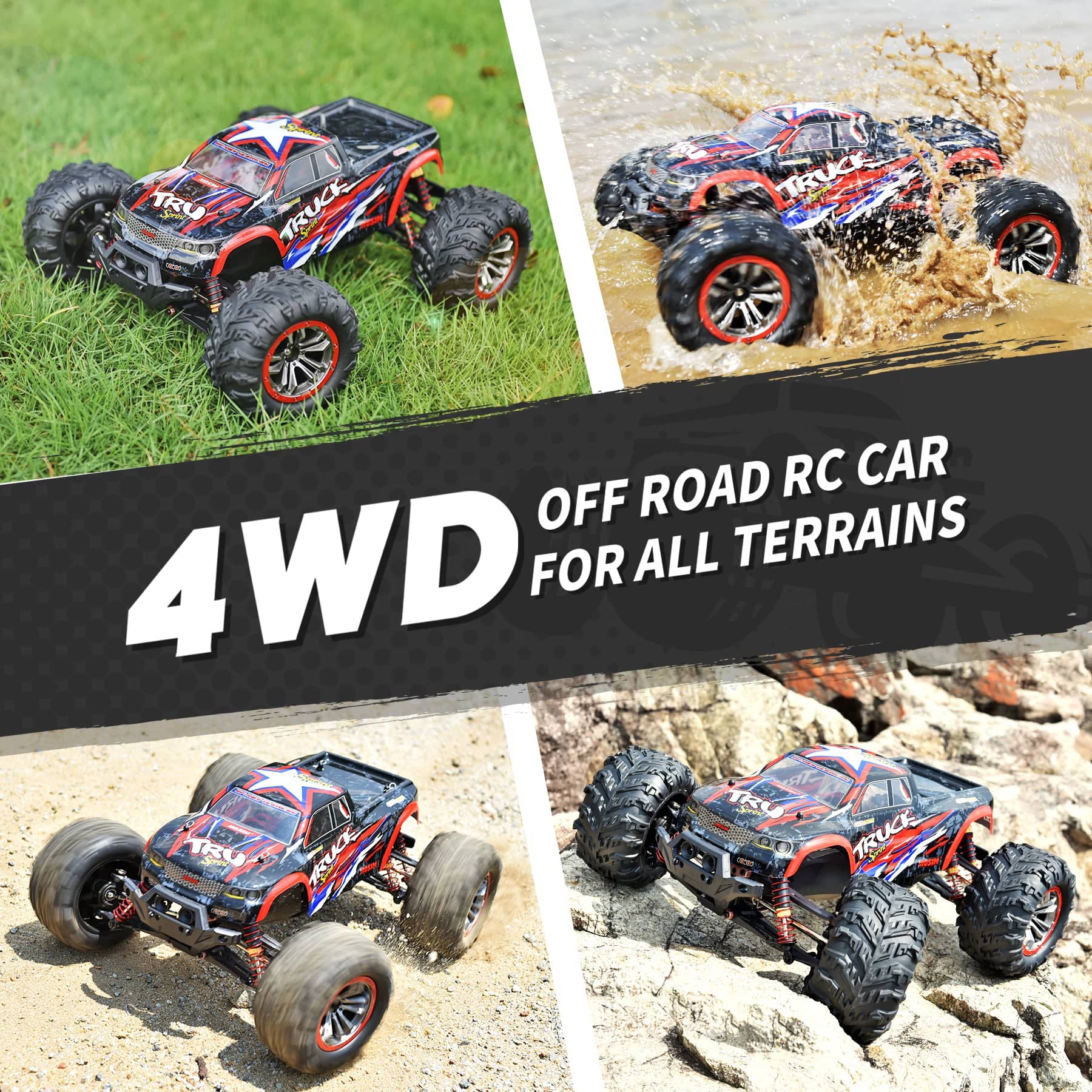 1:10 Scale big size and full proportional super-fast monster truck, all metal sealed ball Bearing are the oil filLed metal shocks special designed for tough environments and any rugged roads. Built with a steel chassis shaft structure and an independently stimulated shockproof system that reduces impact on the offroad rc cars unsteady drives.