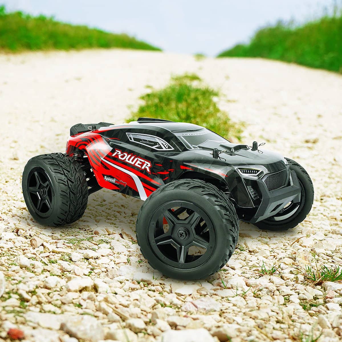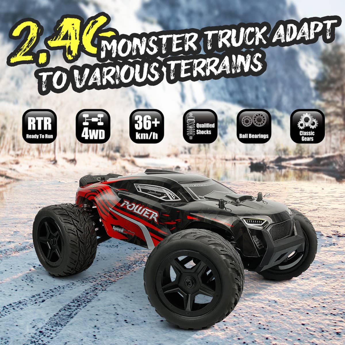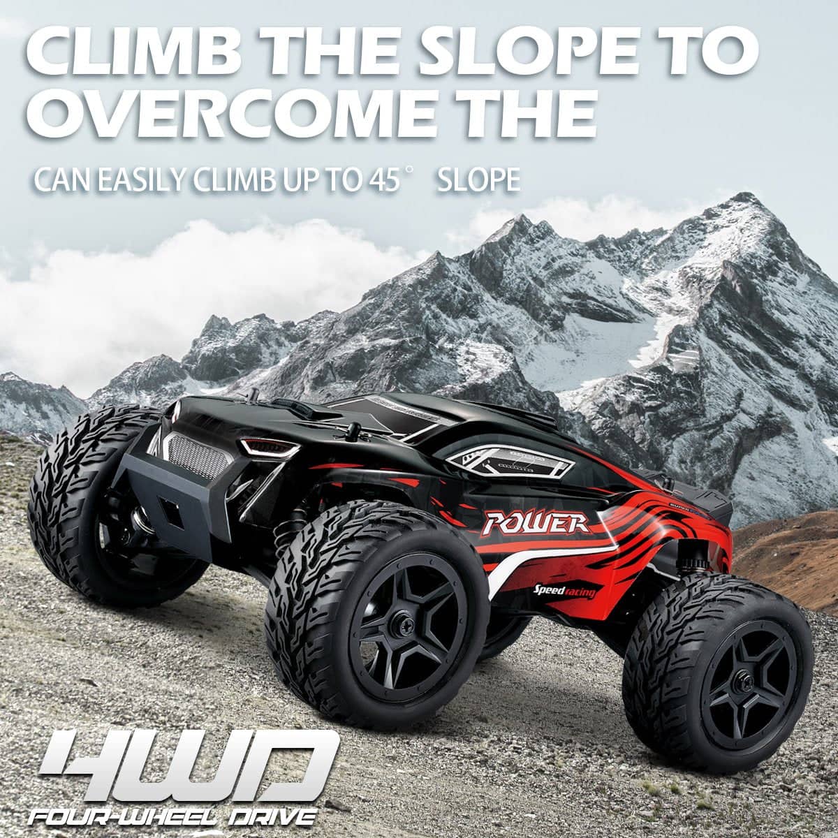 1:14 Scale big size and full proportional super-fast monster truck are special designed for tough environments and any rugged roads. The max speed is up to 38km/h, which makes the car race faster than others.