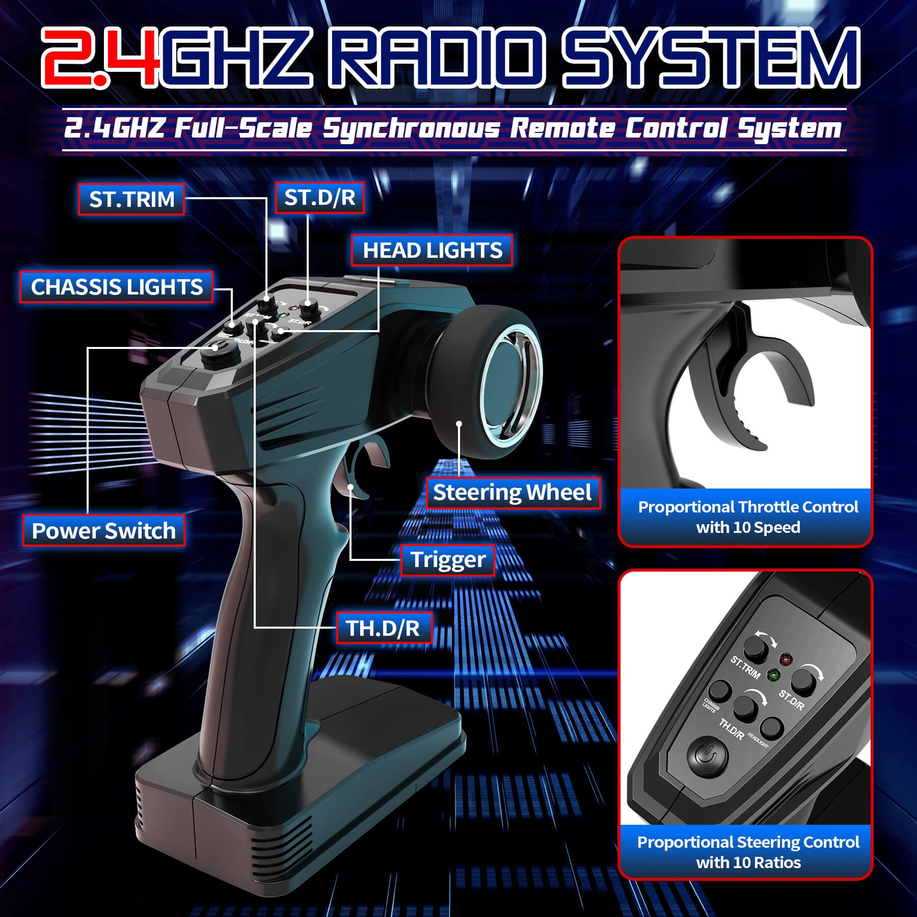 2.4Ghz Full-function Accurate Radio System: rc monster truck highly responsive steering and throttle, you can racer with your friends or kids at the same time. Splash waterproof electronic components make a all-terrain vehicle out of this truck. No worries to run this remote control cars on grassland , sands, and bumpy grounds.