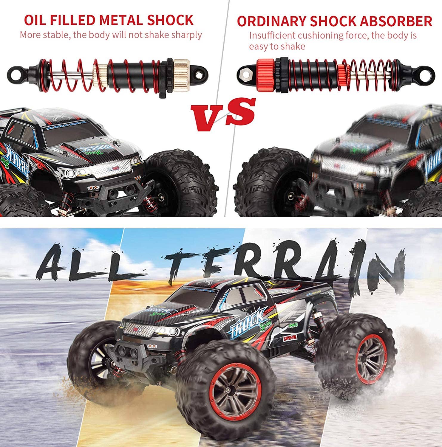 1:10 Scale big size and full proportional super-fast monster truck, all metal sealed ball Bearing are the oil filLed metal shocks special designed for tough environments and any rugged roads. Built with a steel chassis shaft structure and an independently stimulated shockproof system that reduces impact on unsteady drives.