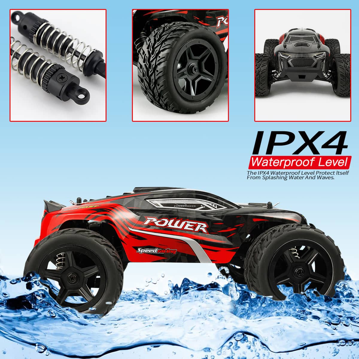 1:14 Scale big size and full proportional super-fast monster truck are special designed for tough environments and any rugged roads. The max speed is up to 38km/h, which makes the car race faster than others.