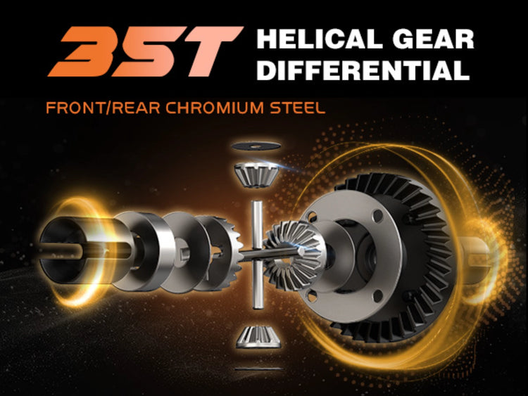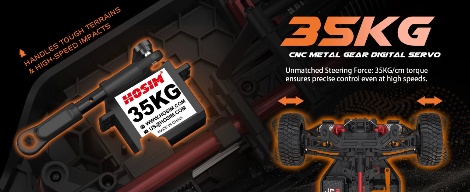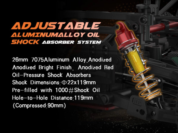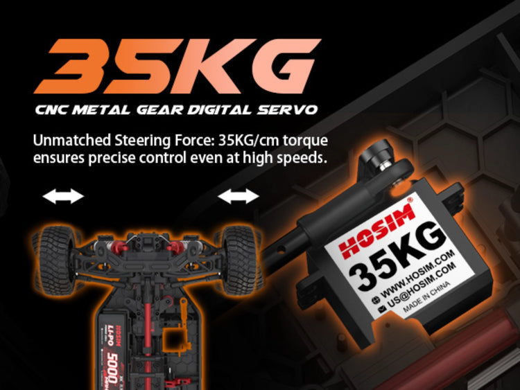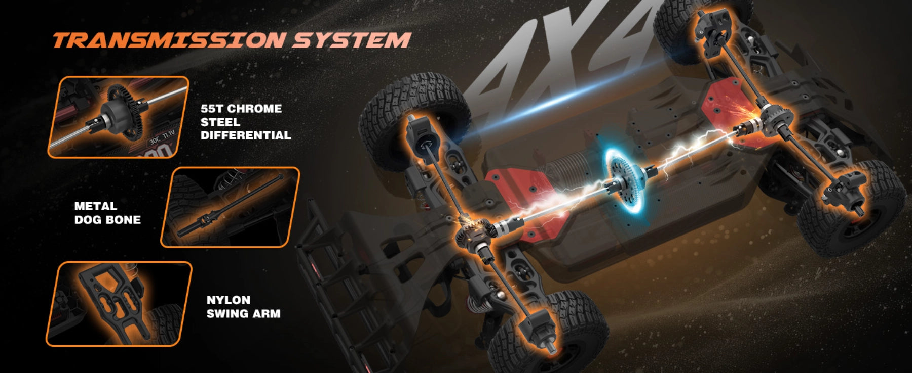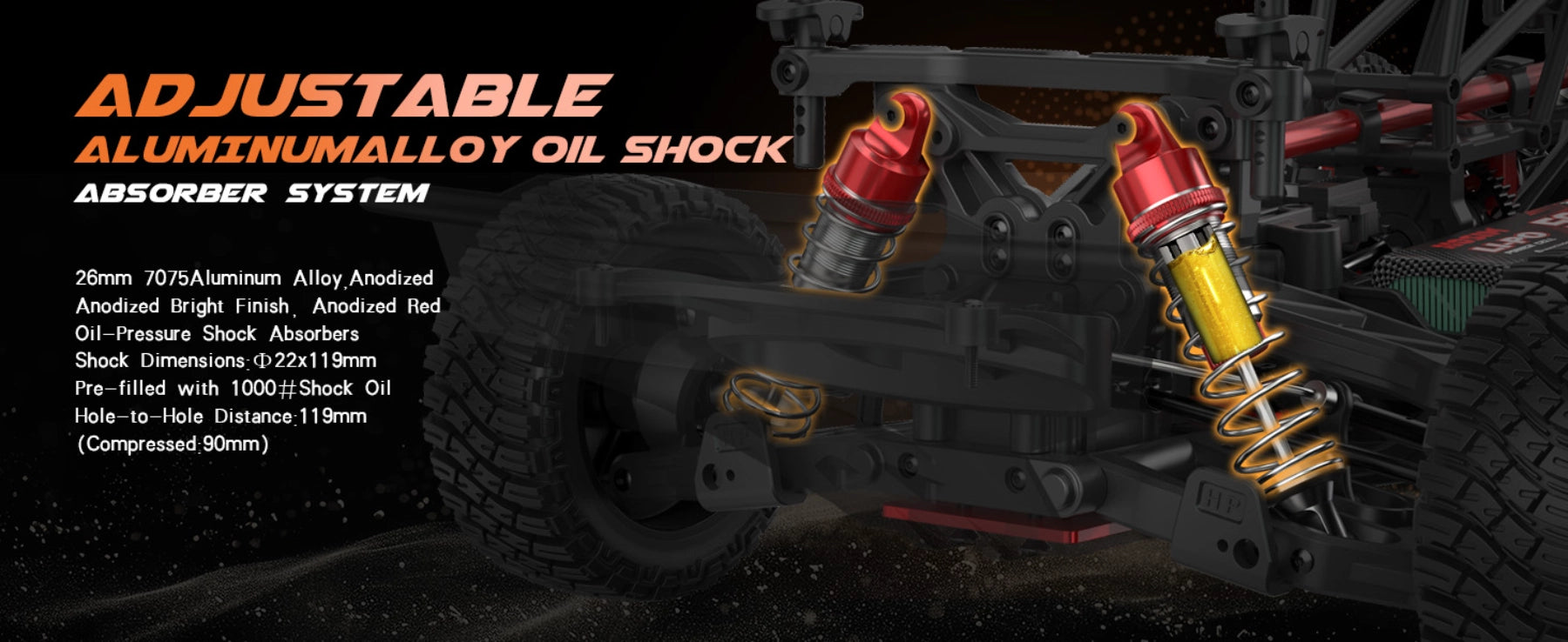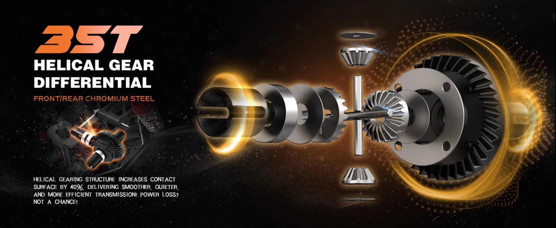Built to dominate the toughest terrains, the M33 features a full 40Cr chromium steel gear transmission, including a 55T center diff, 35T spiral diffs, and 9T main gear. The heat-treated 1144 steel drive shafts and CVD front axles ensure maximum impact resistance and smooth power delivery. The 26mm aluminum oil-filled shocks and reinforced chassis provide superior stability and control.