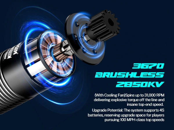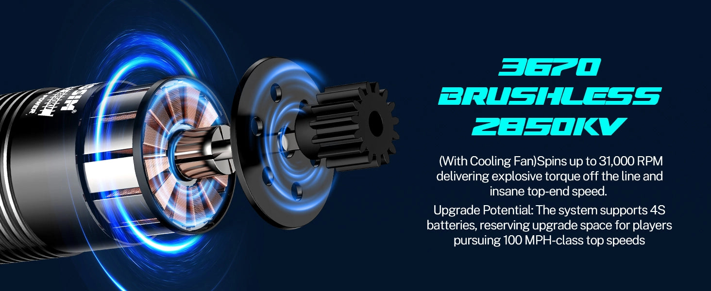 3670 Brushless Beast: Features a 2850KV high-performance motor paired with a dedicated aluminum heatsink and cooling fan.