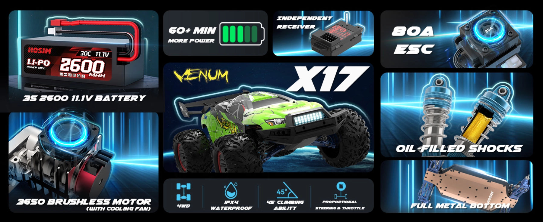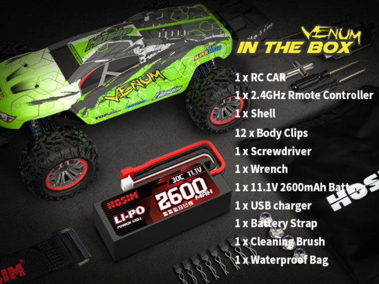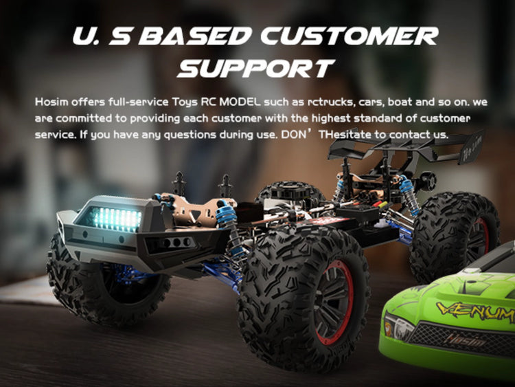 The monster truck is equipped with 3650 powerful brushless motor with heat sink and cooling fan. Compared with the brushed motor, the brushless motor has 2-3 times the life of the brushed motor and consumes only 1/3 of the power of the brushed motor. built in 85A brushless ESC makes the RC buggy more potential and upgradable, precision engineering design makes it have the maximum energy conversion.