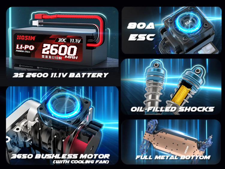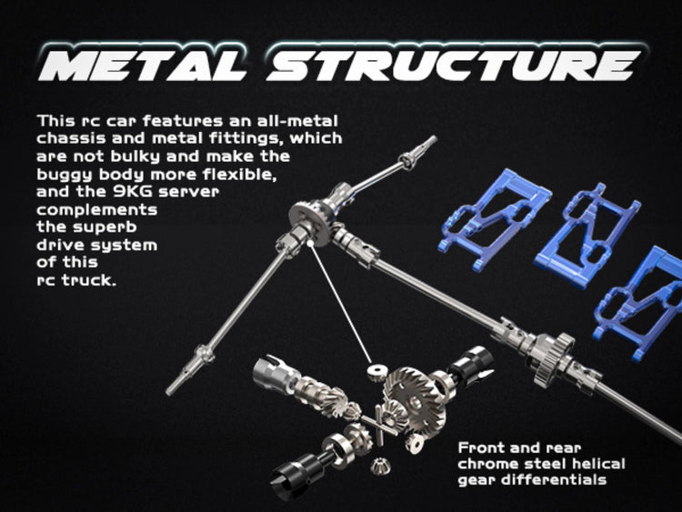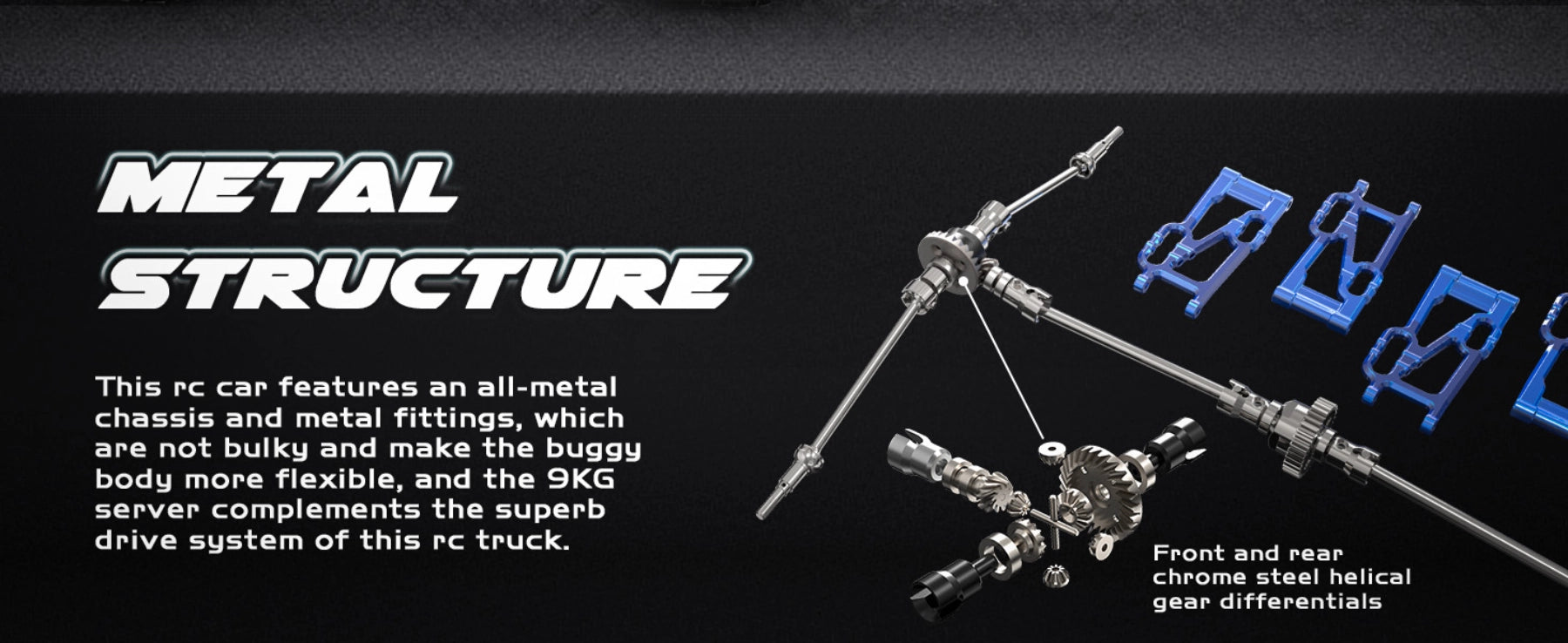 The rc racing car features an all-metal undercarriage, metal hydraulic shocks to make the racing vehicle fun on all surfaces. The metal swing arm and adjustable linkage, as well as functional limiting straps, keep the solid axle firmly positioned. LED lighting system, 9K servos complement the superb drive system of this RC car, and all four wheels are fitted with independent suspension springs for a more agile buggy body.